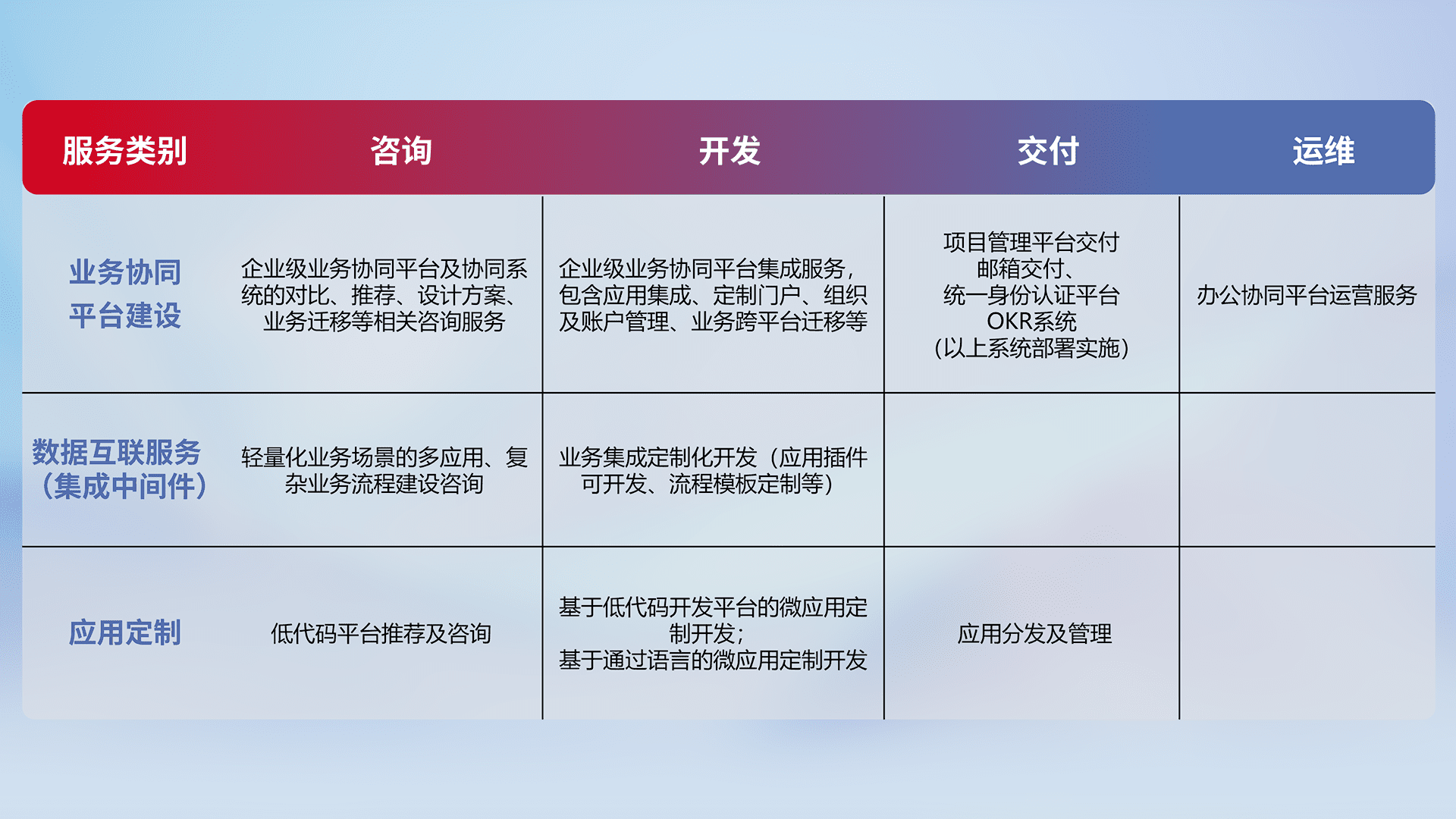 针对钉钉、、企微、、IDaas等平台级产品提供产品的规划、、、方案、、、交付、、、、定制化开发等服务,,,实现如统一协同办公、、智能客户服务、、混合会议管理、、智能数据查询、、、、等业务场景,,,实现数字化转型。。。。